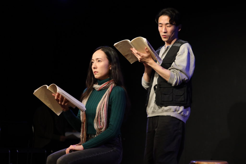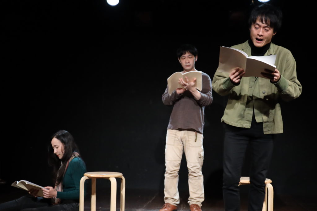 リーディングに集った俳優の亀田佳明さん、石村みかさん、大石将弘さん、今井聡さん、花純あやのさん、そして私は、演出の林英樹さんのもと率先してアイデアを出し合い、シンプルなステージングながら凄惨でユーモラスなこの戯曲世界を逞しく立ち上げ、そこに宿された「亡霊たちの声」を観客席にもしっかり共有できたことが、その反応からも感じられた。